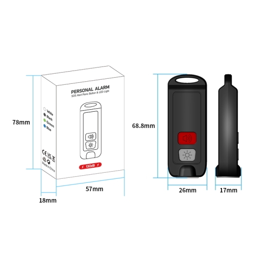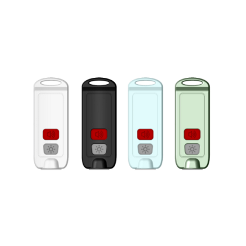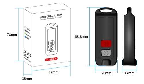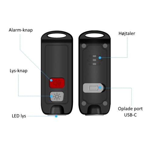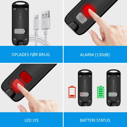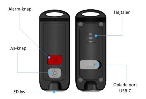 Alarmen aktiveres, når du trykker to gange på alarm-knappen. Overfaldsalarmen er også udstyret med en LED-lampe som automatisk blinker ved alarm, men kan også bruges som alm. lommelygte ved at trykke på lys-knappen